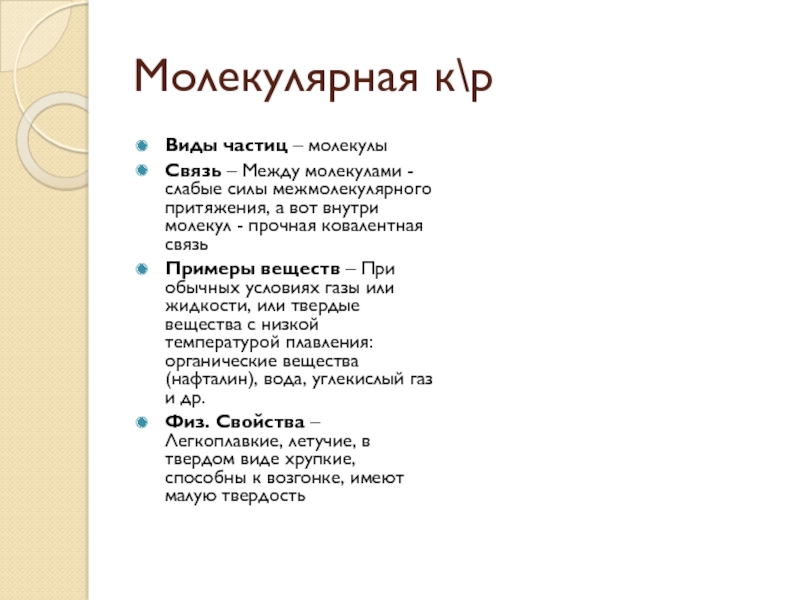 Примеры веществ – При обычных условиях газы или жидкости, или твердые вещества с низкой температурой плавления: органические вещества (нафталин), вода, углекислый газ и др.