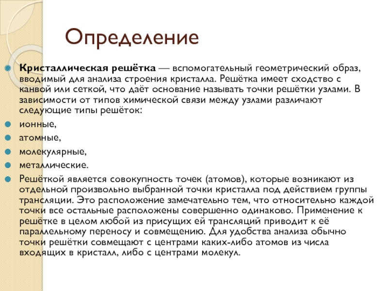 Кристаллическая решётка — вспомогательный геометрический образ, вводимый для анализа строения кристалла.