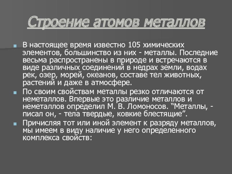 Причисляя тот или иной элемент к разряду металлов, мы имеем в виду наличие у него определенного комплекса свойств: