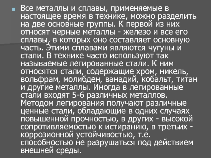 разделить на две основные группы. К первой из них относят черные металлы - железо и все его сплавы, в которых оно составляет основную часть. Этими сплавами являются чугуны и стали. В технике часто используют так называемые легированные стали. К ним относятся стали, содержащие хром, никель, вольфрам, молибден, ванадий, кобальт, титан и другие металлы. Иногда в легированные стали входят 5-6 различных металлов. Методом легирования получают различные ценные стали, обладающие в одних случаях повышенной прочностью, в других - высокой сопротивляемостью к истиранию, в третьих - коррозионной устойчивостью, т.е. способностью не разрушаться под действием внешней среды.