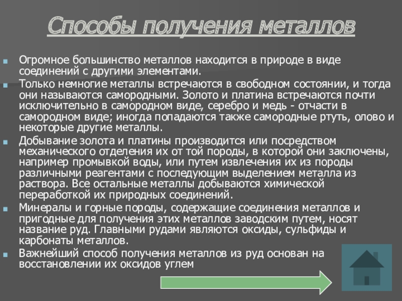 Только немногие металлы встречаются в свободном состоянии, и тогда они называются самородными. Золото и платина встречаются почти исключительно в самородном виде, серебро и медь - отчасти в самородном виде; иногда попадаются также самородные ртуть, олово и некоторые другие металлы.