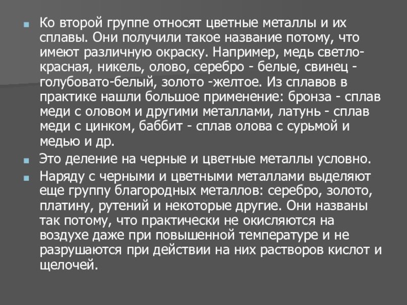 Слайд 6Ко второй группе относят цветные металлы и их сплавы. Они получили