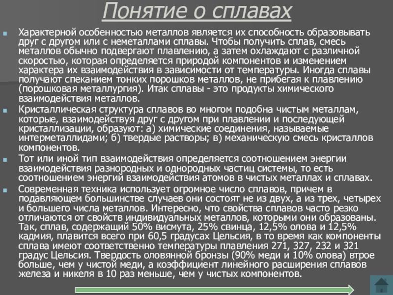 с другом или с неметаллами сплавы. Чтобы получить сплав, смесь металлов обычно подвергают плавлению, а затем охлаждают с различной скоростью, которая определяется природой компонентов и изменением характера их взаимодействия в зависимости от температуры. Иногда сплавы получают спеканием тонких порошков металлов, не прибегая к плавлению (порошковая металлургия). Итак сплавы - это продукты химического взаимодействия металлов.