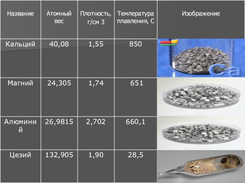 По плотности металлы условно подразделяются на две большие группы: легкие металлы, плотность которых не больше 5 г/см 3 , и тяжелые металлы - все остальные. Плотность, а также температуры плавления некоторых металлов приведены в таблице №1.