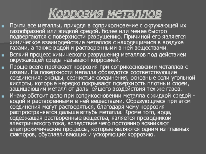 газообразной или жидкой средой, более или менее быстро подвергаются с поверхности разрушению. Причиной его является химическое взаимодействие металлов с находящимися в воздухе газами, а также водой и растворенными в ней веществами.