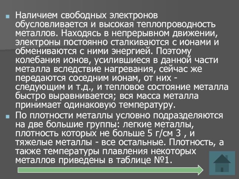 Слайд 10Наличием свободных электронов обусловливается и высокая теплопроводность металлов. Находясь в непрерывном