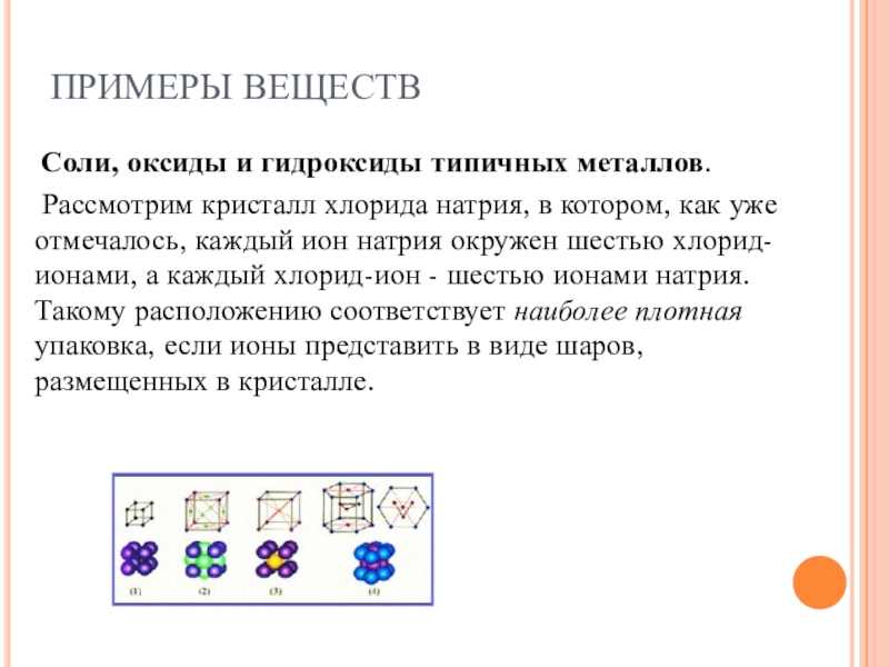 ПРИМЕРЫ ВЕЩЕСТВ  Соли, оксиды и гидроксиды типичных металлов.   Рассмотрим кристалл хлорида натрия, в котором, как