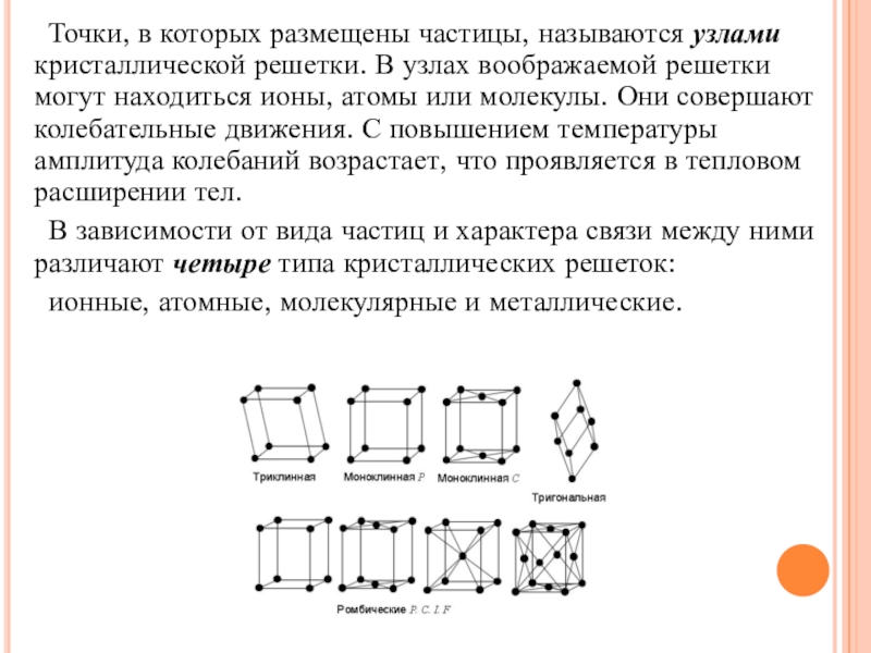 Точки, в которых размещены частицы, называются узлами кристаллической решетки. В узлах воображаемой решетки могут находиться