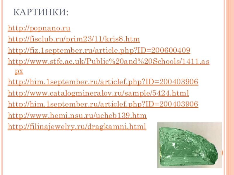 КАРТИНКИ:http://popnano.ruhttp://fisclub.ru/prim23/11/kris8.htmhttp://fiz.1september.ru/article.php?ID=200600409http://www.stfc.ac.uk/Public%20and%20Schools/1411.aspxhttp://him.1september.ru/articlef.php?ID=200403906http://www.catalogmineralov.ru/sample/5424.htmlhttp://him.1september.ru/articlef.php?ID=200403906http://www.hemi.nsu.ru/ucheb139.htmhttp://filinajewelry.ru/dragkamni.html