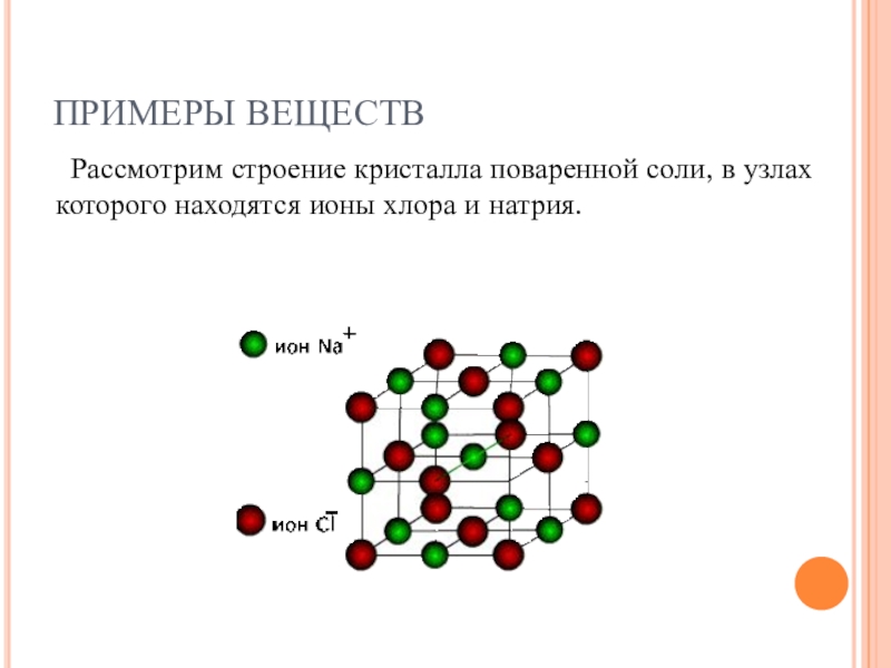 ПРИМЕРЫ ВЕЩЕСТВ   Рассмотрим строение кристалла поваренной соли, в узлах которого находятся ионы хлора и натрия.