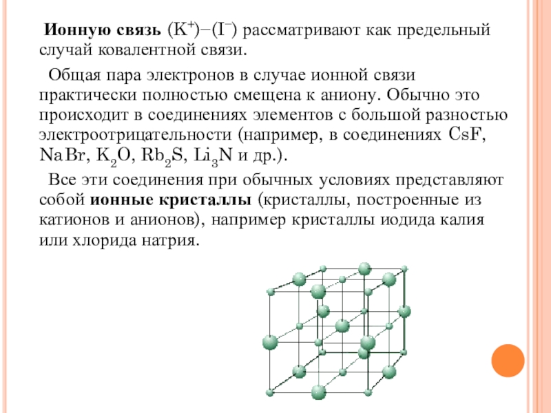 Слайд 5 Ионную связь (K+)−(I−) рассматривают как предельный случай ковалентной связи.