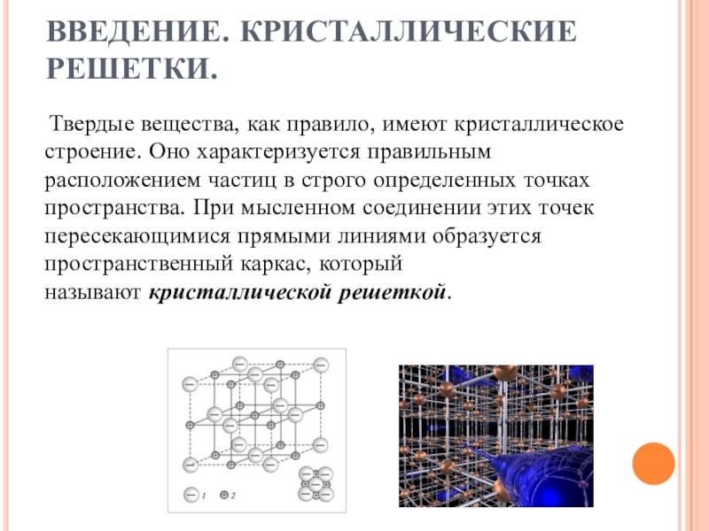 ВВЕДЕНИЕ. КРИСТАЛЛИЧЕСКИЕ РЕШЕТКИ. Твердые вещества, как правило, имеют кристаллическое строение. Оно характеризуется правильным расположением частиц в строго определенных точках пространства. При мысленном соединении этих точек пересекающимися прямыми линиями образуется пространственный каркас, который называют кристаллической решеткой.