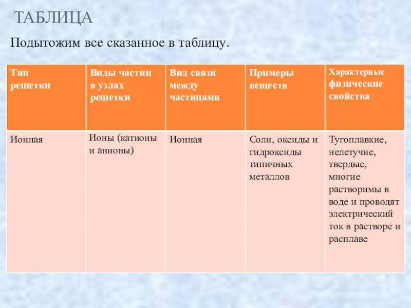 ТАБЛИЦАПодытожим все сказанное в таблицу.