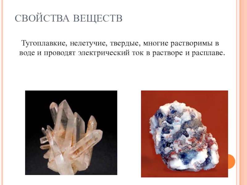СВОЙСТВА ВЕЩЕСТВ  Тугоплавкие, нелетучие, твердые, многие растворимы в воде и проводят электрический ток в растворе и
