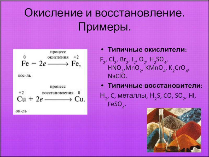 Окисление и восстановление. Примеры.Типичные окислители:F2, Cl2, Br2, I2, O2, H2SO4, HNO3,MnO2, KMnO4, K2CrO4, NaClO.Типичные восстановители:Н2, C, металлы,
