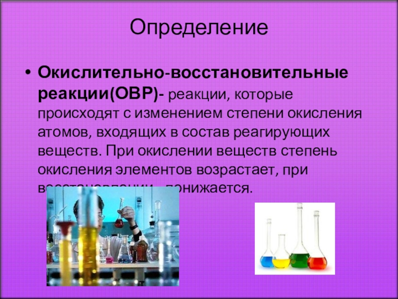 ОпределениеОкислительно-восстановительные реакции(ОВР)- реакции, которые происходят с изменением степени окисления атомов, входящих в состав реагирующих веществ. При окислении