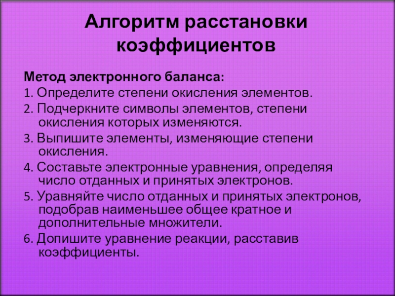 Алгоритм расстановки коэффициентовМетод электронного баланса:1. Определите степени окисления элементов.2. Подчеркните символы элементов, степени окисления которых изменяются.3. Выпишите