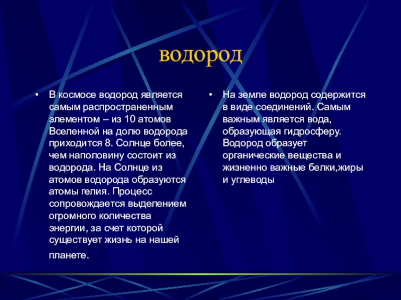 На земле водород содержится в виде соединений. Самым важным является вода, образующая гидросферу. Водород образует органические вещества и жизненно важные белки,жиры и углеводы