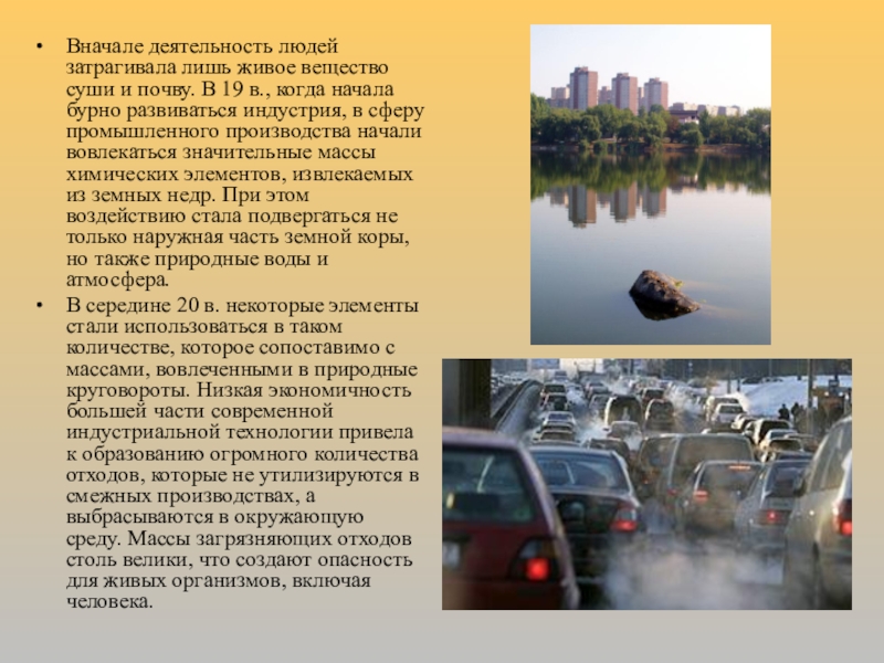 19 в., когда начала бурно развиваться индустрия, в сферу промышленного производства начали вовлекаться значительные массы химических элементов, извлекаемых из земных недр. При этом воздействию стала подвергаться не только наружная часть земной коры, но также природные воды и атмосфера.