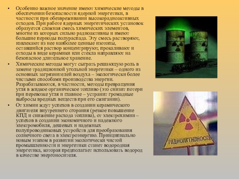 Слайд 5Особенно важное значение имеют химические методы в обеспечении безопасности ядерной энергетики,