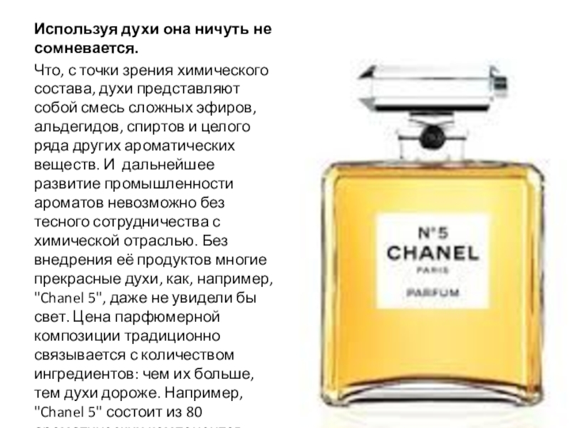 состава, духи представляют собой смесь сложных эфиров, альдегидов, спиртов и целого ряда других ароматических веществ. И дальнейшее развитие промышленности ароматов невозможно без тесного сотрудничества с химической отраслью. Без внедрения её продуктов многие прекрасные духи, как, например, "Chanel 5", даже не увидели бы свет. Цена парфюмерной композиции традиционно связывается с количеством ингредиентов: чем их больше, тем духи дороже. Например, "Chanel 5" состоит из 80 ароматических компонентов.