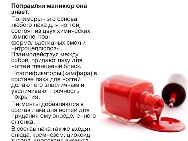 ногтей, состоят из двух химических компонентов: формальдегидных смол и нитроцеллюлозы. Взаимодействуя между собой, придают лаку для ногтей глянцевый блеск.