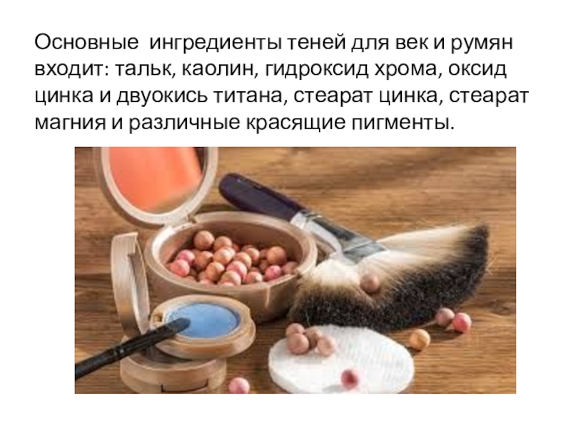 Слайд 6Основные ингредиенты теней для век и румян входит: тальк, каолин, гидроксид