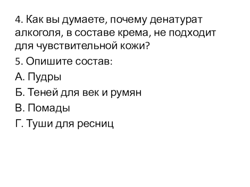 Слайд 144. Как вы думаете, почему денатурат алкоголя, в составе крема, не