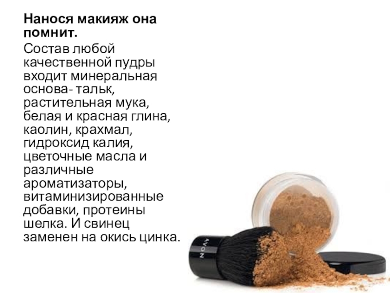 Состав любой качественной пудры входит минеральная основа- тальк,