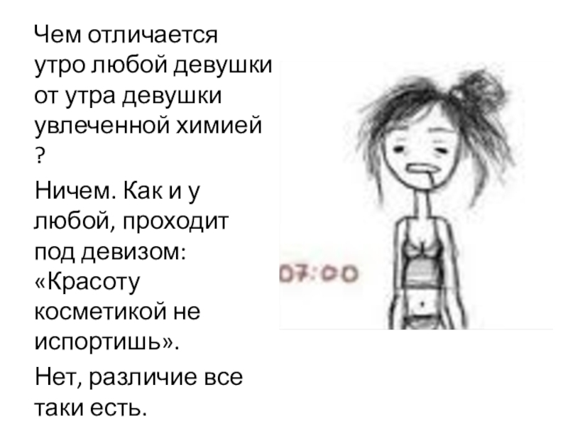 Слайд 2Чем отличается утро любой девушки от утра девушки увлеченной химией ?