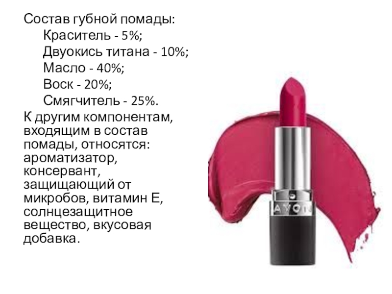 К другим компонентам, входящим в состав помады, относятся: ароматизатор, консервант, защищающий от микробов, витамин Е, солнцезащитное вещество, вкусовая добавка.
