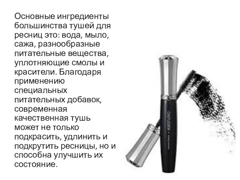 Слайд 8Основные ингредиенты большинства тушей для ресниц это: вода, мыло, сажа, разнообразные