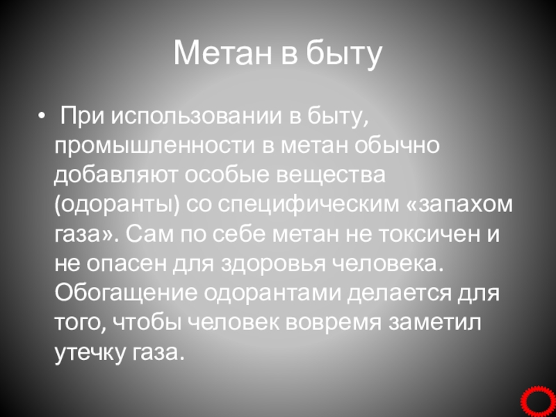 вещества (одоранты) со специфическим «запахом газа». Сам по себе метан не токсичен и не опасен для здоровья человека. Обогащение одорантами делается для того, чтобы человек вовремя заметил утечку газа.