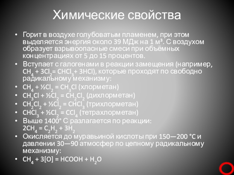Вступает с галогенами в реакции замещения (например, CH4 + 3Cl2= CHCl3+ 3HCl), которые проходят по свободно радикальному механизму: