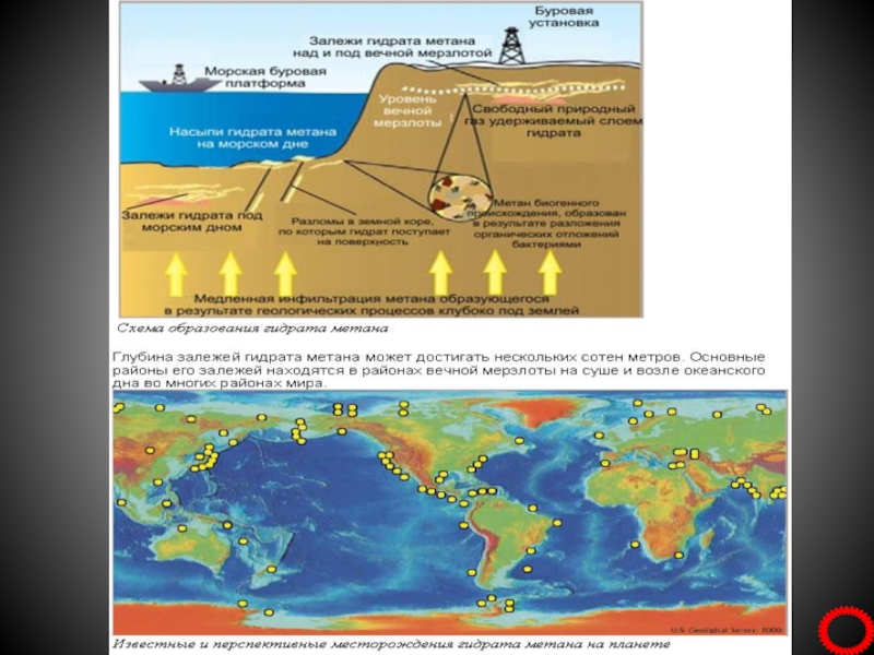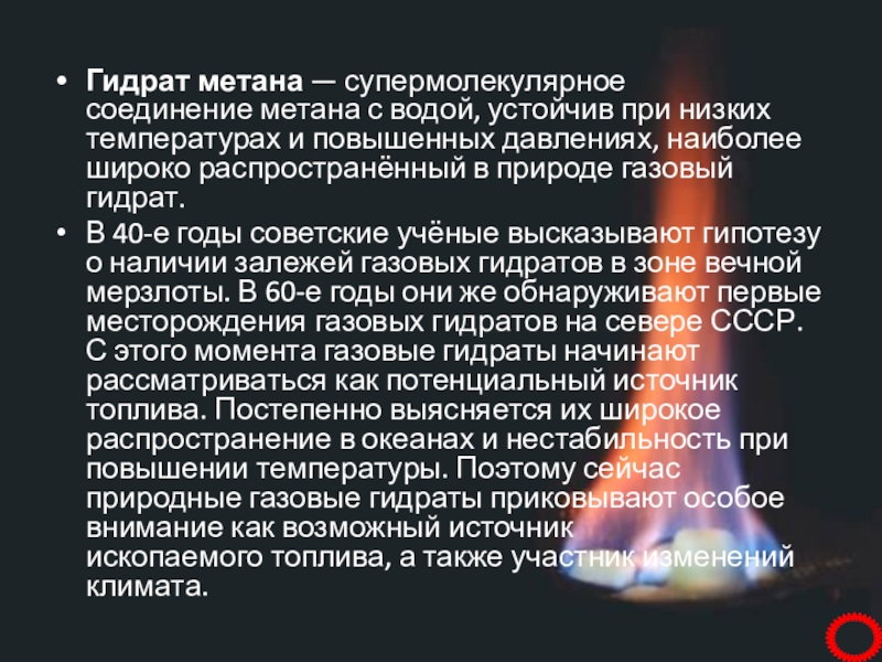 Гидрат метана — супермолекулярное соединение метана с водой, устойчив при низких температурах и повышенных давлениях,