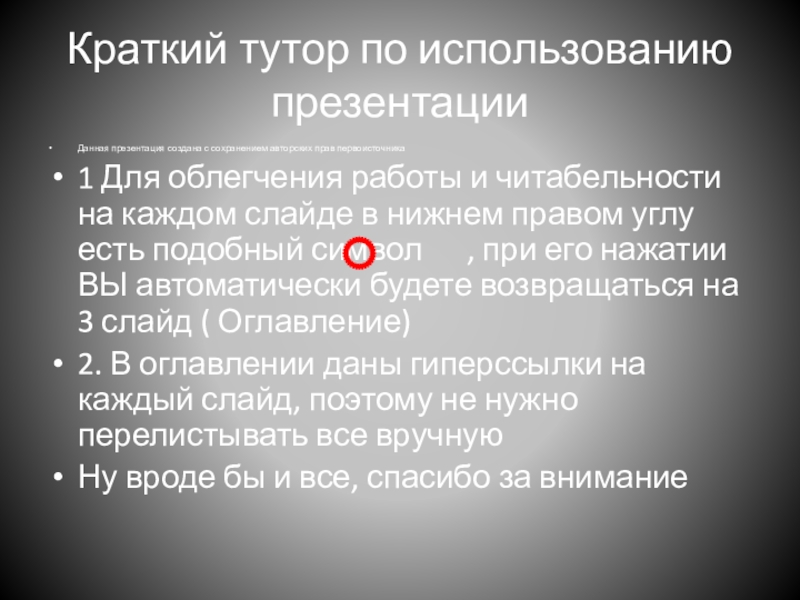 1 Для облегчения работы и читабельности на каждом слайде в нижнем правом углу есть подобный символ , при его нажатии ВЫ автоматически будете возвращаться на 3 слайд ( Оглавление)