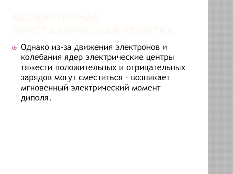 МОЛЕКУЛЯРНАЯ КРИСТАЛЛИЧЕСКАЯ РЕШЕТКАОднако из-за движения электронов и колебания ядер электрические центры тяжести положительных и отрицательных зарядов могут