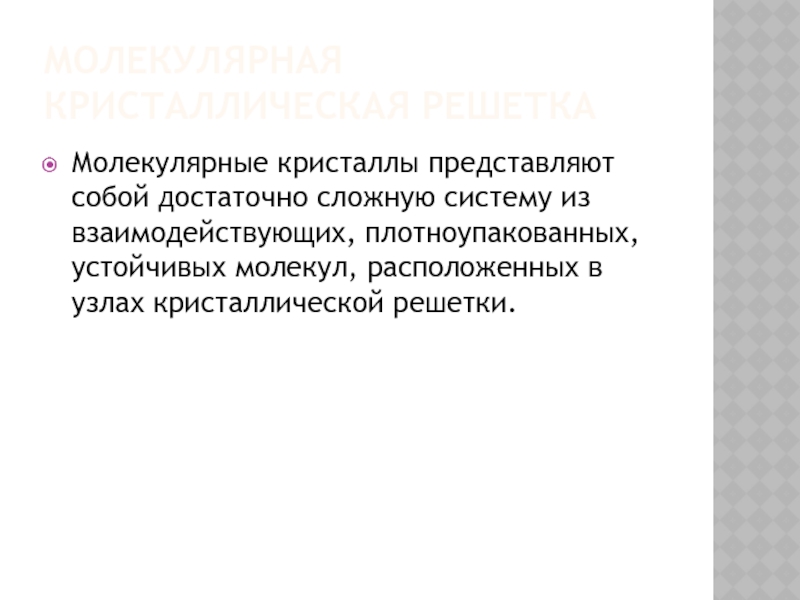 МОЛЕКУЛЯРНАЯ КРИСТАЛЛИЧЕСКАЯ РЕШЕТКАМолекулярные кристаллы представляют собой достаточно сложную систему из взаимодействующих, плотноупакованных, устойчивых молекул, расположенных в узлах