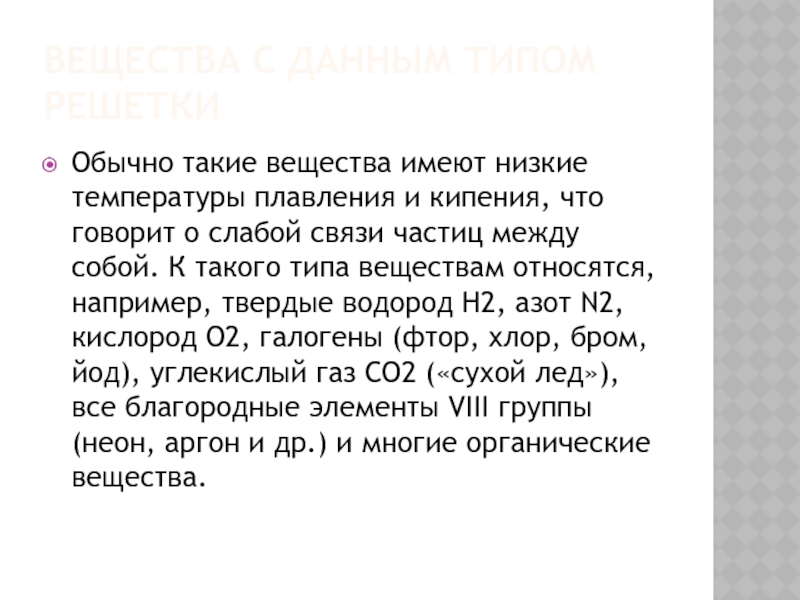 ВЕЩЕСТВА С ДАННЫМ ТИПОМ РЕШЕТКИОбычно такие вещества имеют низкие температуры плавления и кипения, что говорит о слабой