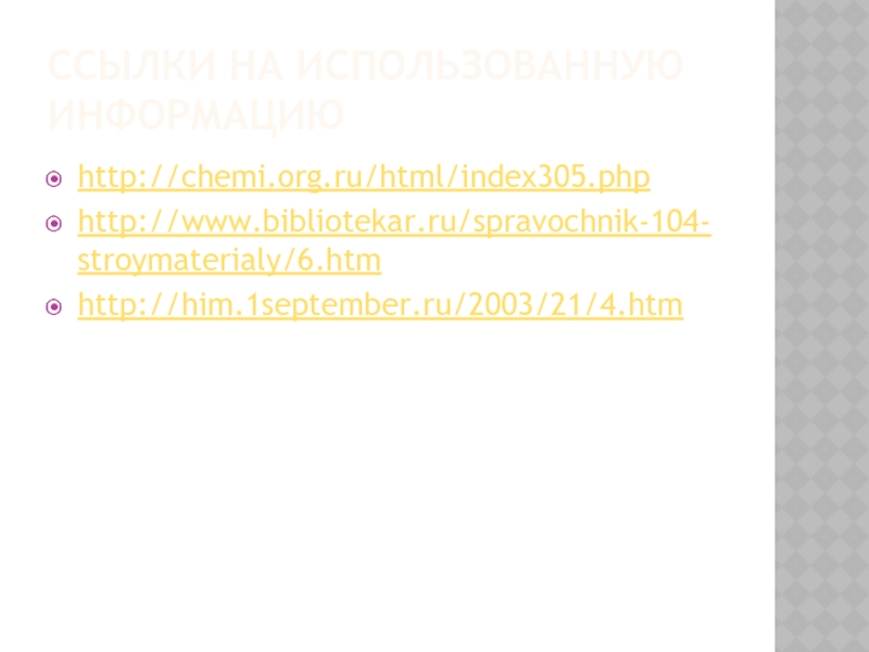 ССЫЛКИ НА ИСПОЛЬЗОВАННУЮ ИНФОРМАЦИЮhttp://chemi.org.ru/html/index305.phphttp://www.bibliotekar.ru/spravochnik-104-stroymaterialy/6.htmhttp://him.1september.ru/2003/21/4.htm