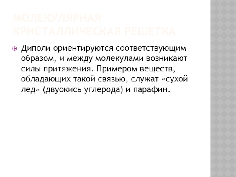МОЛЕКУЛЯРНАЯ КРИСТАЛЛИЧЕСКАЯ РЕШЕТКАДиполи ориентируются соответствующим образом, и между молекулами возникают силы притяжения. Примером веществ, обладающих такой связью,