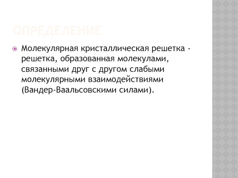 ОПРЕДЕЛЕНИЕМолекулярная кристаллическая решетка - решетка, образованная молекулами, связанными друг с другом слабыми молекулярными взаимодействиями (Вандер-Ваальсовскими силами).