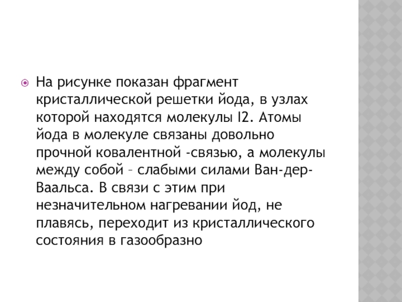 молекулы I2. Атомы йода в молекуле связаны довольно прочной ковалентной -связью, а молекулы между собой – слабыми силами Ван-дер-Ваальса. В связи с этим при незначительном нагревании йод, не плавясь, переходит из кристаллического состояния в газообразно