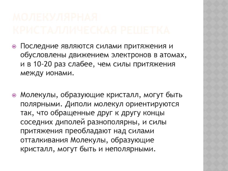 МОЛЕКУЛЯРНАЯ КРИСТАЛЛИЧЕСКАЯ РЕШЕТКАПоследние являются силами притяжения и обусловлены движением электронов в атомах, и в 10-20 раз слабее,