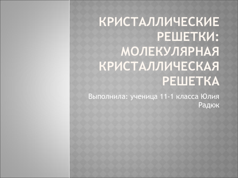 КРИСТАЛЛИЧЕСКИЕ РЕШЕТКИ: МОЛЕКУЛЯРНАЯ КРИСТАЛЛИЧЕСКАЯ РЕШЕТКАВыполнила: ученица 11-1 класса Юлия Радюк