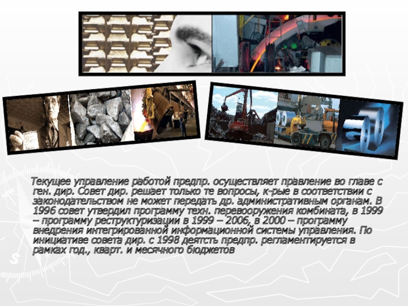 ген. дир. Совет дир. решает только те вопросы, к-рые в соответствии с законодательством не может передать др. административным органам. В 1996 совет утвердил программу техн. перевооружения комбината, в 1999 – программу реструктуризации в 1999 – 2006, в 2000 – программу внедрения интегрированной информационной системы управления. По инициативе совета дир. с 1998 деятсть предпр. регламентируется в рамках год., кварт. и месячного бюджетов