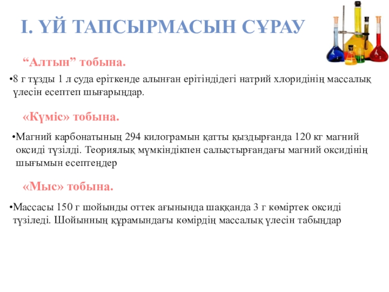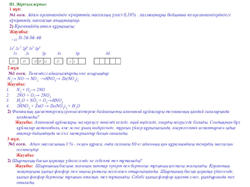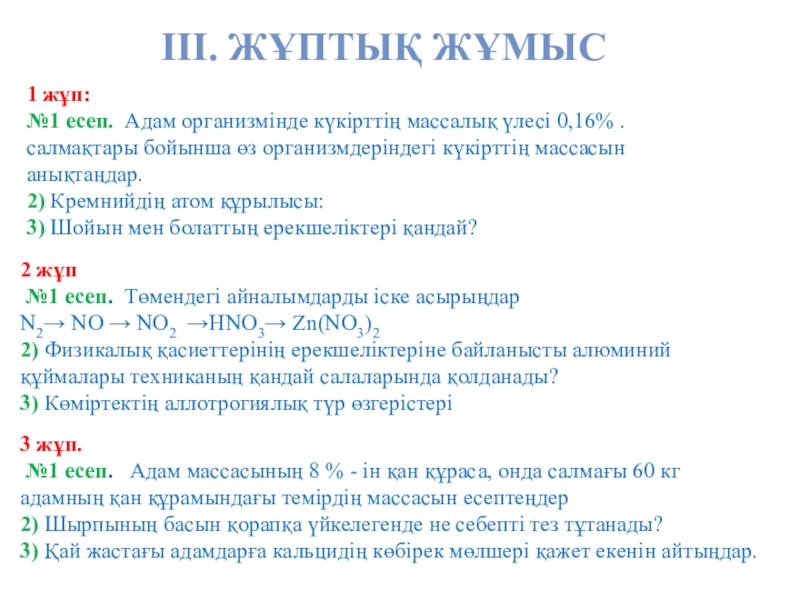 №1 есеп. Адам массасының 8 % - ін қан құраса, онда салмағы 60 кг адамның қан құрамындағы темірдің массасын есептеңдер