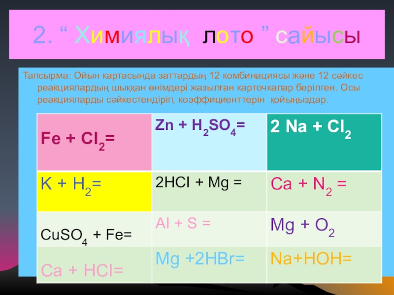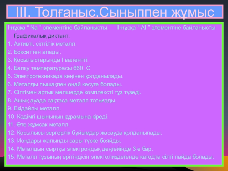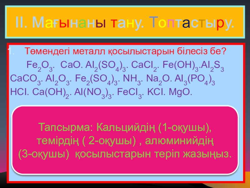 Тапсырма: Кальцийдің (1-оқушы), темірдің ( 2-оқушы) , алюминийдің