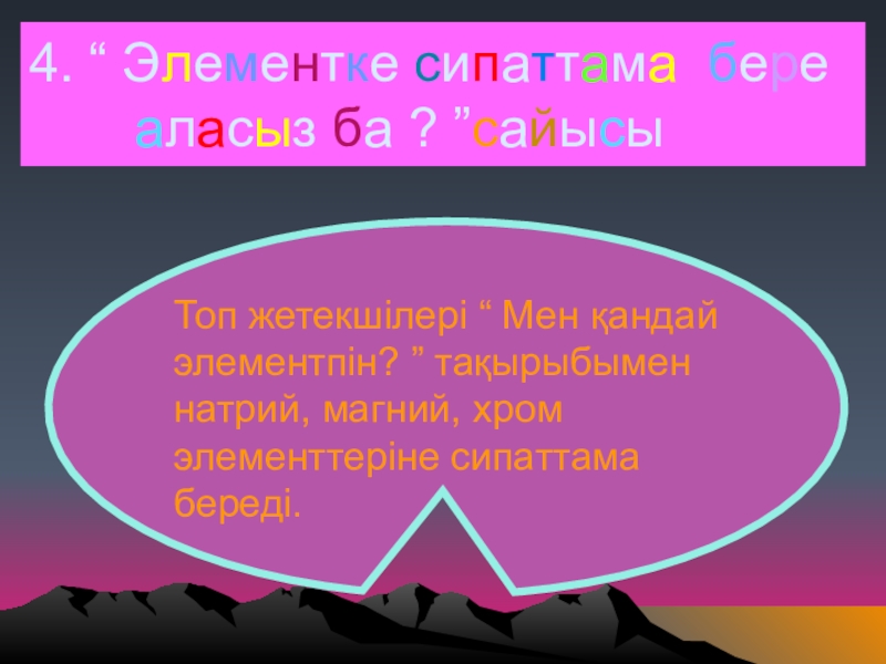Топ жетекшілері “ Мен қандай элементпін? ” тақырыбымен натрий, магний, хром элементтеріне сипаттама береді.