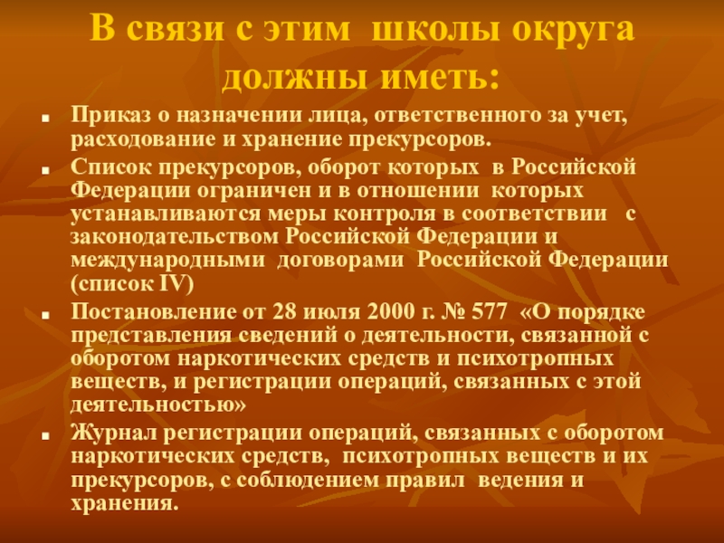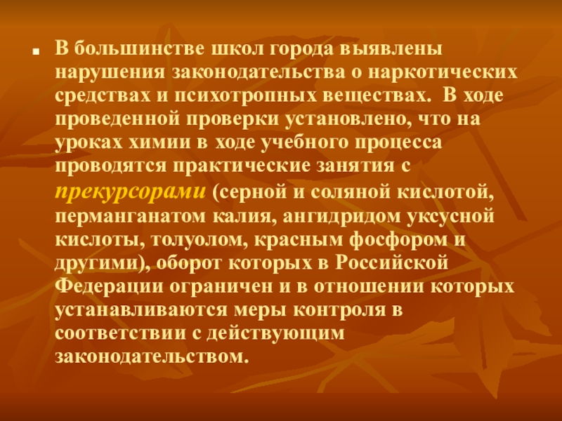 психотропных веществах. В ходе проведенной проверки установлено, что на уроках химии в ходе учебного процесса проводятся практические занятия с прекурсорами (серной и соляной кислотой, перманганатом калия, ангидридом уксусной кислоты, толуолом, красным фосфором и другими), оборот которых в Российской Федерации ограничен и в отношении которых устанавливаются меры контроля в соответствии с действующим законодательством.